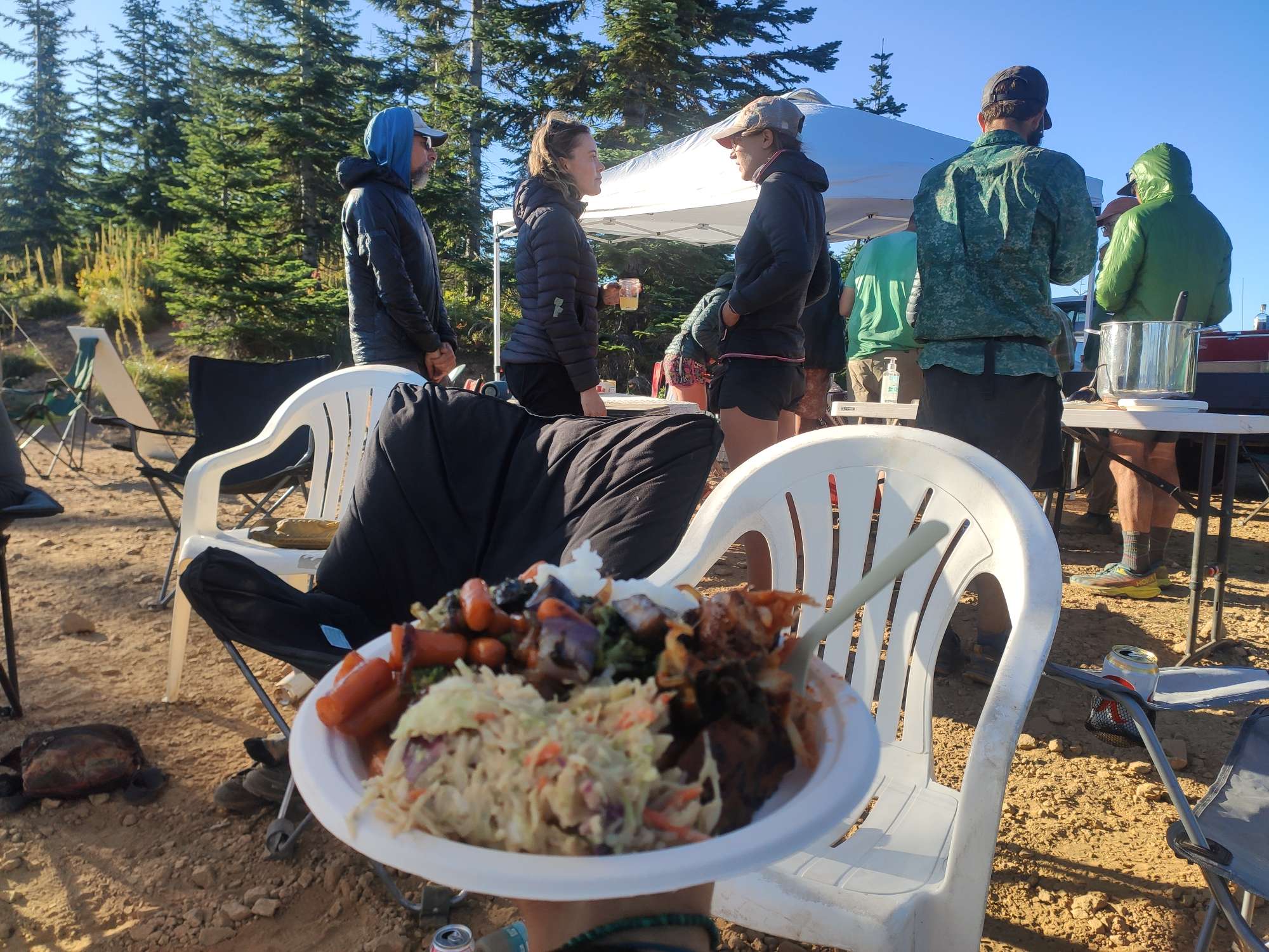Onderweg hadden we weer geluk. Er waren 4 mannen trail magic aan het doen en twee ervan waren vroeger proffesionele chefs! Er was bier, cocktails, een buffet, … En het eten was geweldig. Zonder twijfel een van mijn beste maaltijden op de trail! Er waren ook nog andere hikers en het was een gezellige avond. En omdat we op die plek hadden gekampeerd konden we ook genieten van een uitgebreid ontbijt de volgende dag.