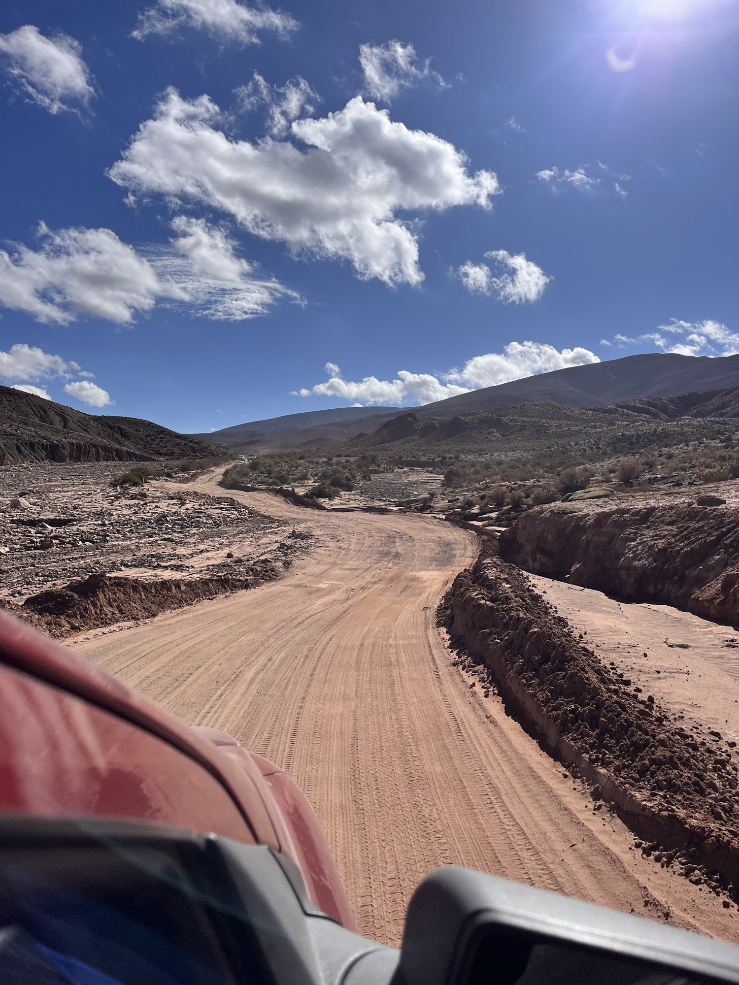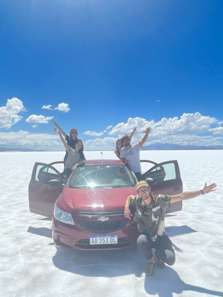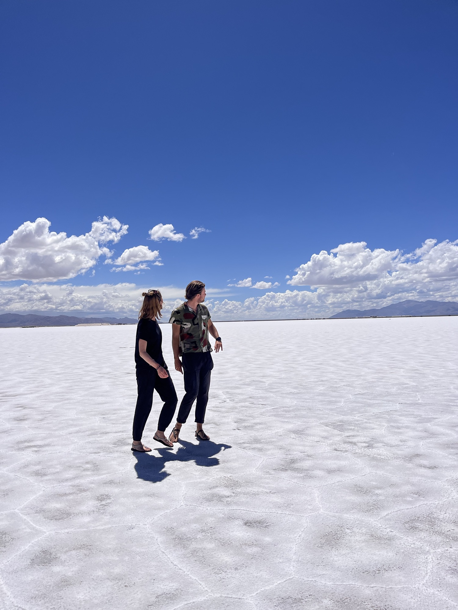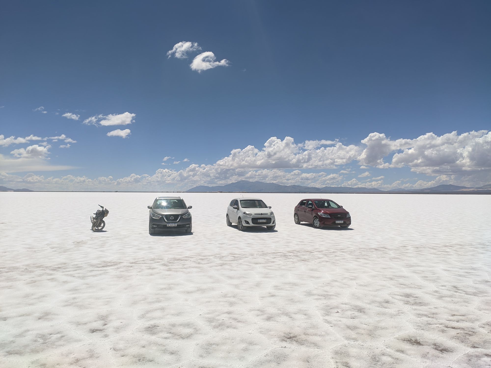 Vandaag was het de langste dag rijden, naar de zoutvlaktes van Argentinië. Normaal is heel deze route over de bergen op asfalt, maar omdat er een brug is ingezakt moet iedereen een omleiding nemen op een onverharde zandige weg. Ook hier was het dus weer traag rijden en de putten ontwijken. Maar de 3u rijden werd weeral beloond met een uniek stukje natuur! Het is een grappig zicht om alle mensen op zo’n grote witte vlakte te zien.