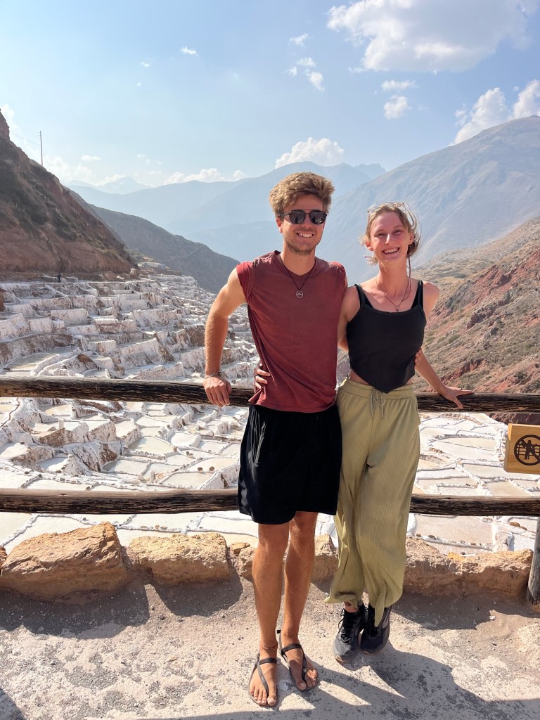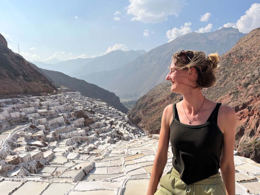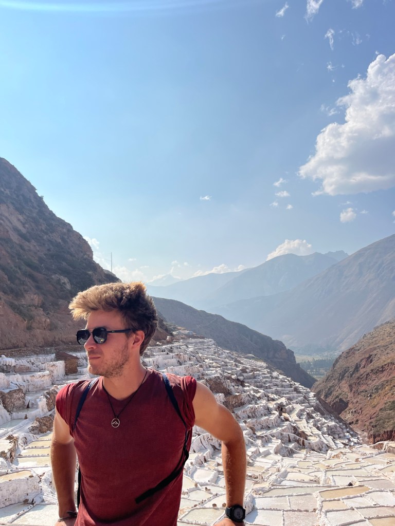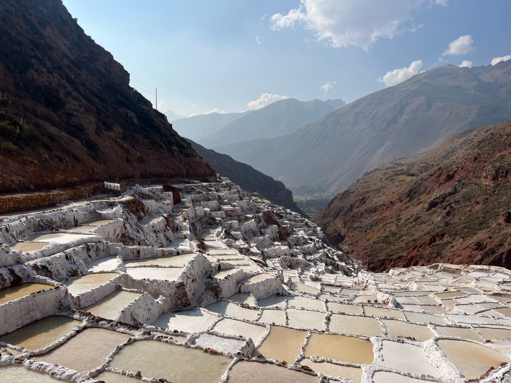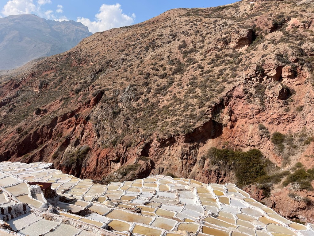 In de buurt bevinden zich zoutterrassen. Ook een waanzinnig coole plek! Op een hoogte van 3000m bevinden zich meer dan 5000 terrasjes/badjes die worden gebruikt voor zoutgewinning voor al 500 jaar aan een stuk. De Inca’s maakten gebruik van de zoute waterbron die hier ontspringt uit de berg door badjes te vormen op de bergwand die gevuld kunnen worden met het water. Het water verdampt, het zout wordt verzameld en het terrasje wordt terug gevuld. Ze worden nog steeds gebruikt. Elk badje is privé-eigendom van een familie. Het is een echt een gek, uniek zicht: de roodkleurige bergen met wit gekleurde terrasjes.