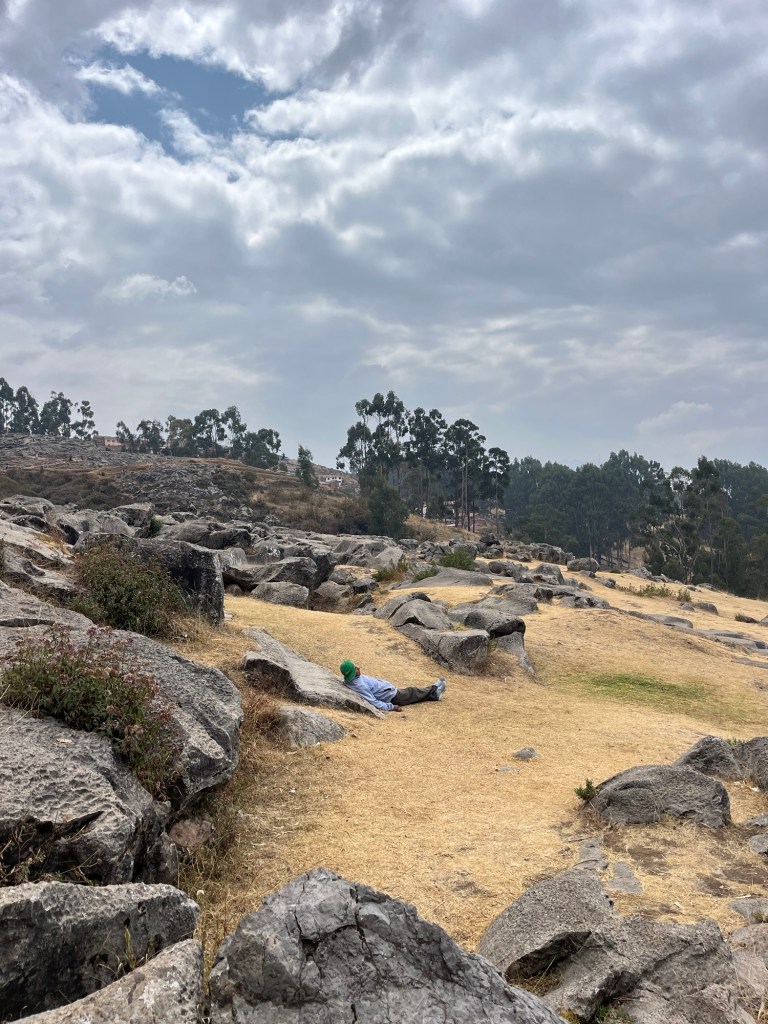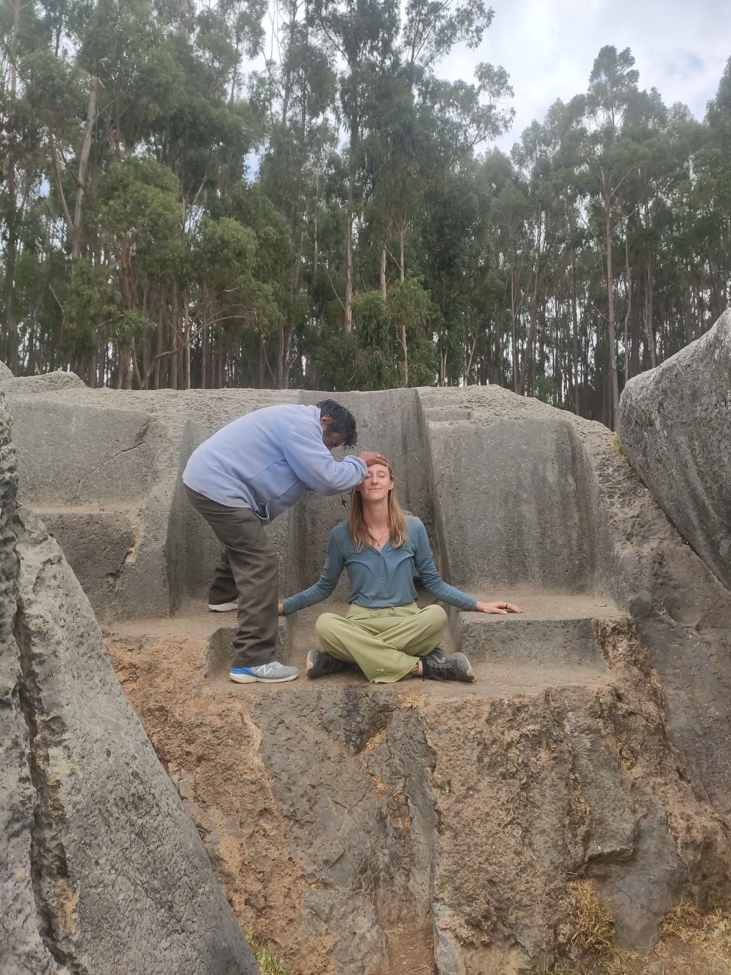 Bij Q’enqo ontmoeten we een slapende, lichtdronken man. Hij wordt wakker en spreekt ons aan. Hij schakelt soms onbewust over naar Quechua, de lokale taal naast Spaans, waarvan je echt geen knijt verstaat. Hij leidt mij naar een Incatroon in de rots waar hij mij met een handoplegging en gemurmel in het Quechua goede energie toestuurt.