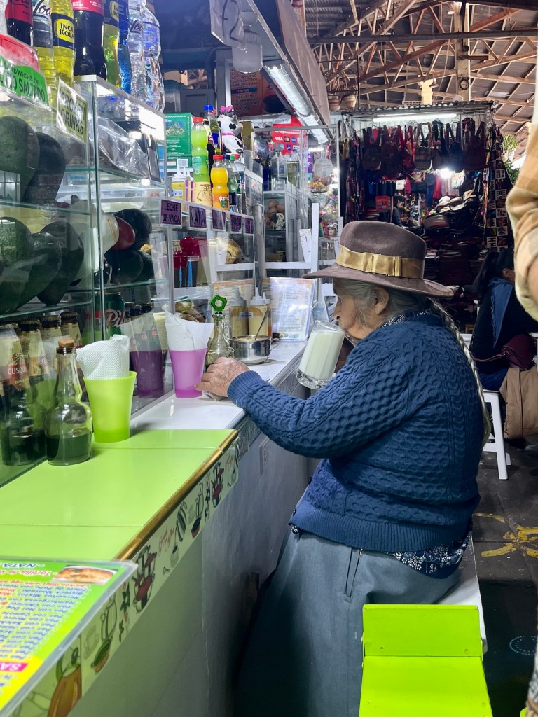 We genoten van lekkernijen op de markten. Net zoals dit vrouwtje genoot van haar warme melk op de markt.