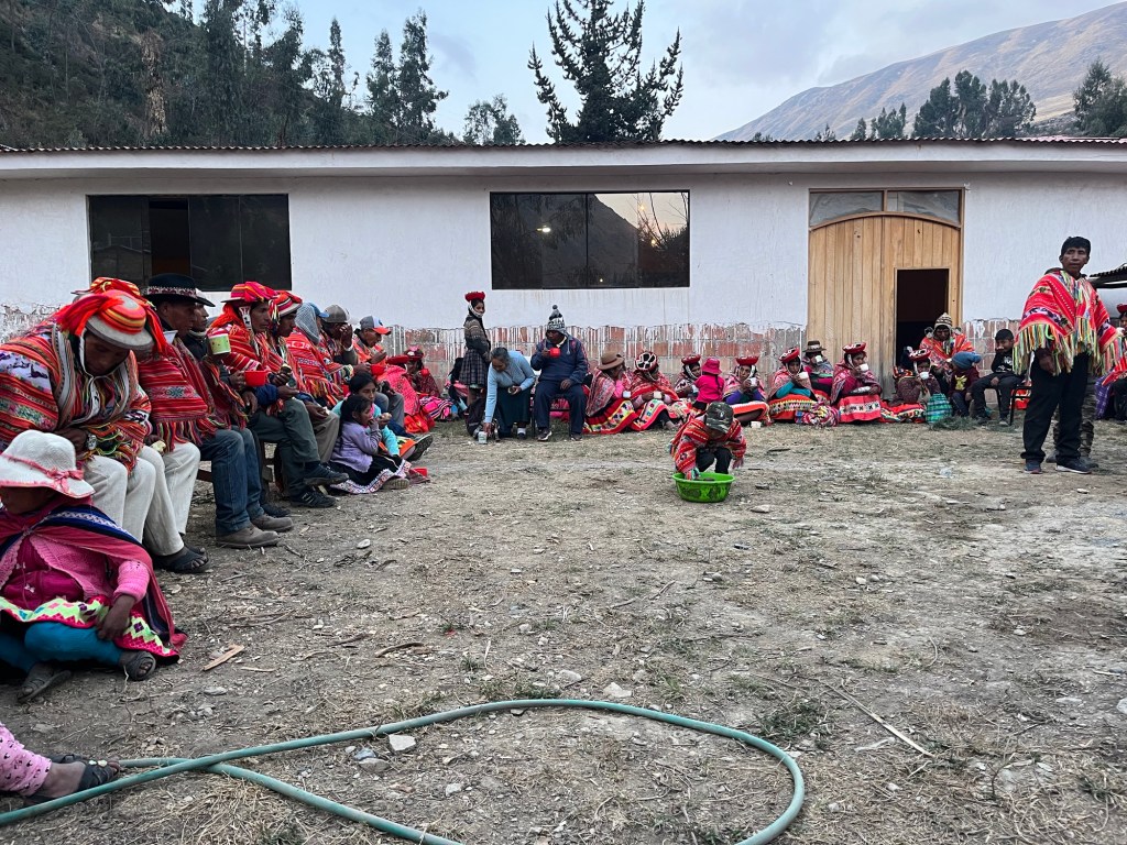Iedereen verlaat de zaal en enkele minuten na de heel heftige gebeurtenis in de kerk zitten we met de kleurrijke gemeenschap buiten in een kring aardappelen en alpacasoep te delen.