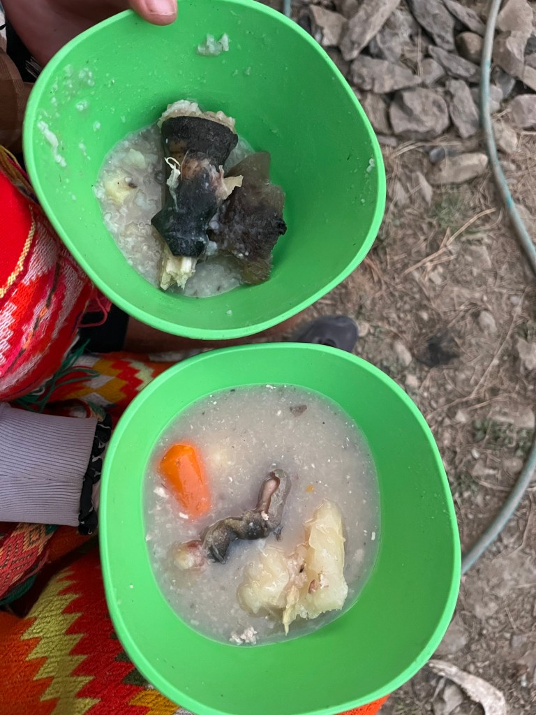 De alpacasoep is interessant: flubberig en iedereen heeft een deel van de alpaca. De vrouw naast mij had een kaak met tanden in haar soep drijven, die smakelijk afgeknabbeld wordt. De botjes met een vettig zwart vel erover in onze soep blijven een raadsel welk lichaamsdeel ze zijn.
