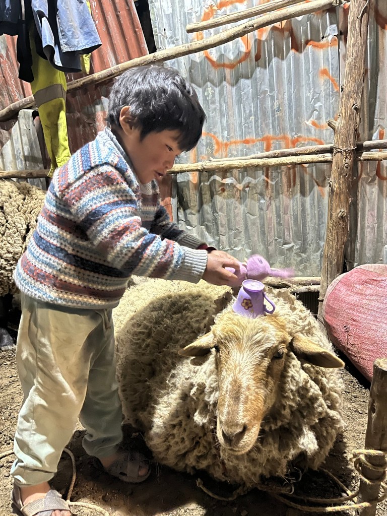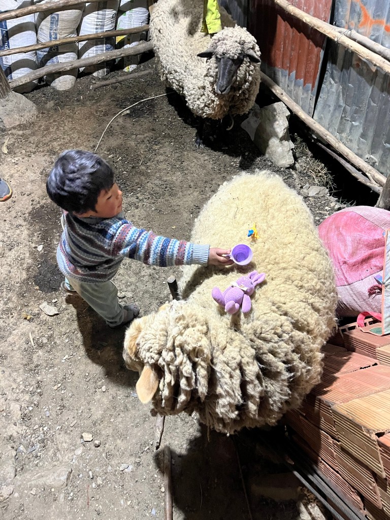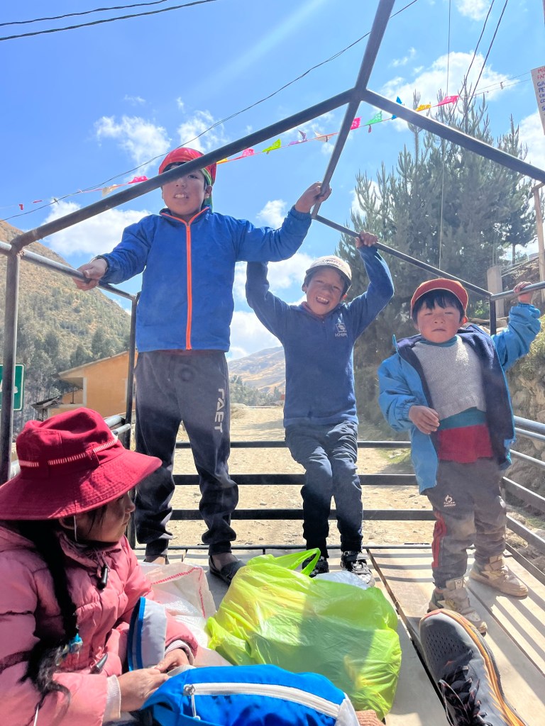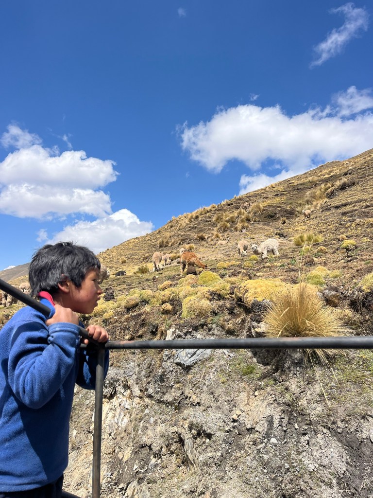 We springen achterin de laadbak van de moto met de vier kinderen. Het was hilarisch met de kinderen die door elkaar geschud worden in de bak op de zandwegen door de bergen. We rijden over een bergpas langs meren en heel veel lama’s en alpacas in het landschap. Na toch een tijdje oncomfortabel rijden, vertelt Juan ons dat het ‘nog maar anderhalf uur rijden is’, we schrokken ons een bult dat het zo ver was.