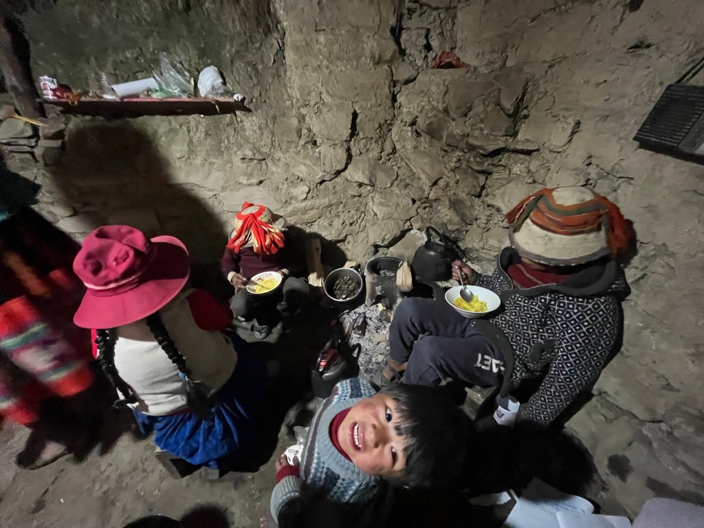 We keren terug naar huis, daar maken Christiano en Adriano vuur voor ons in de keukenhut om op te warmen. De gemeenschap is gevestigd op een hoogte van 3800m, de lucht is er droog en ijl, de zon erg sterk en ‘s nachts koelt het hier af. De kaakjes en handen van de kinderen zijn droog en al bevlekt door de straffe zon zonder protectie. Fortona maakt eten klaar voor de kinderen die niet hebben kunnen meegenieten van de alpacaflubber bij de kerk. We zitten met het hele gezin gezellig samen in de warme kleien hut op kleine krukjes en schapenvellen; theetjes drinken en papieren vliegtuigjes vouwen.