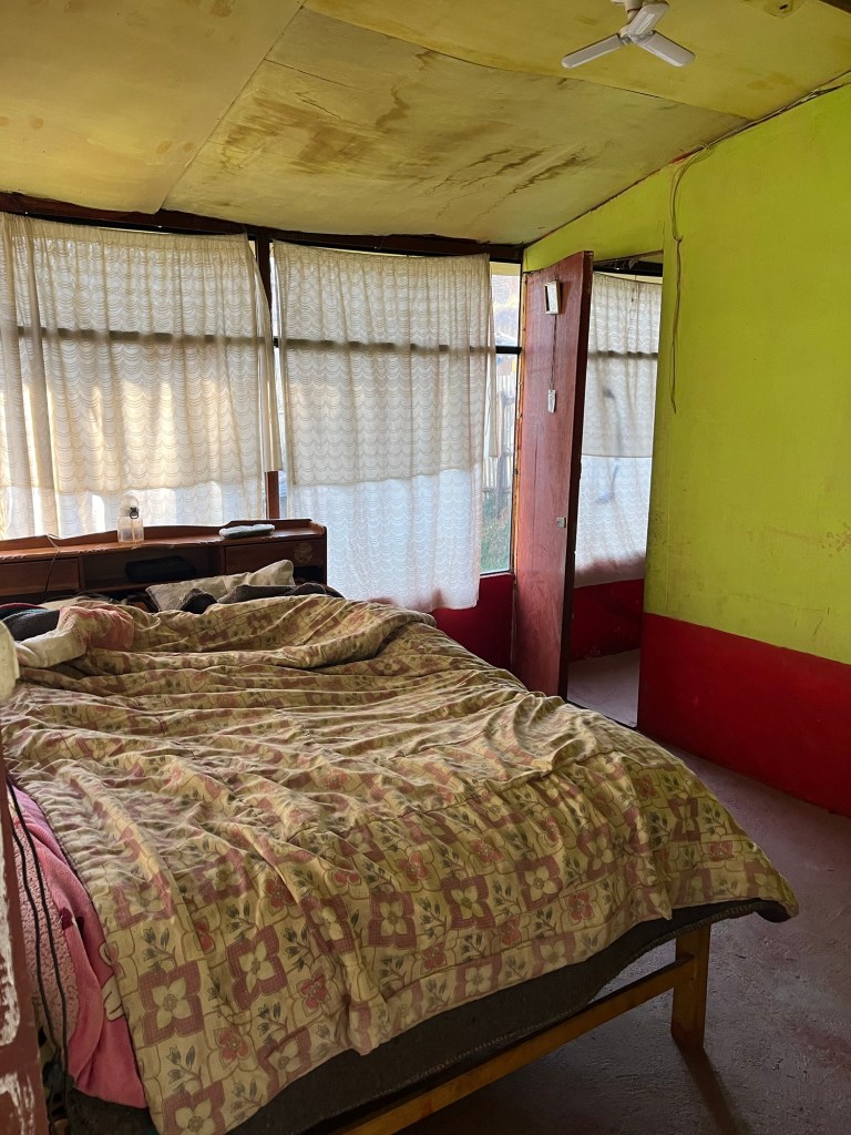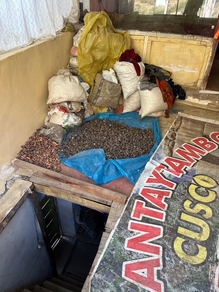 Er is een buitenkoer met een moesstuintje, kippen en waar ‘s nachts ook de schapen staan, het toilet buiten en een kleien kamer waar vuur gemaakt en gekookt wordt. Binnen in het huis krijgen we een proper kamertje, maar het gezin van 6 slaapt samen in 2 dubbele bedden. In de gang worden de gedroogde aardappelen bewaard.