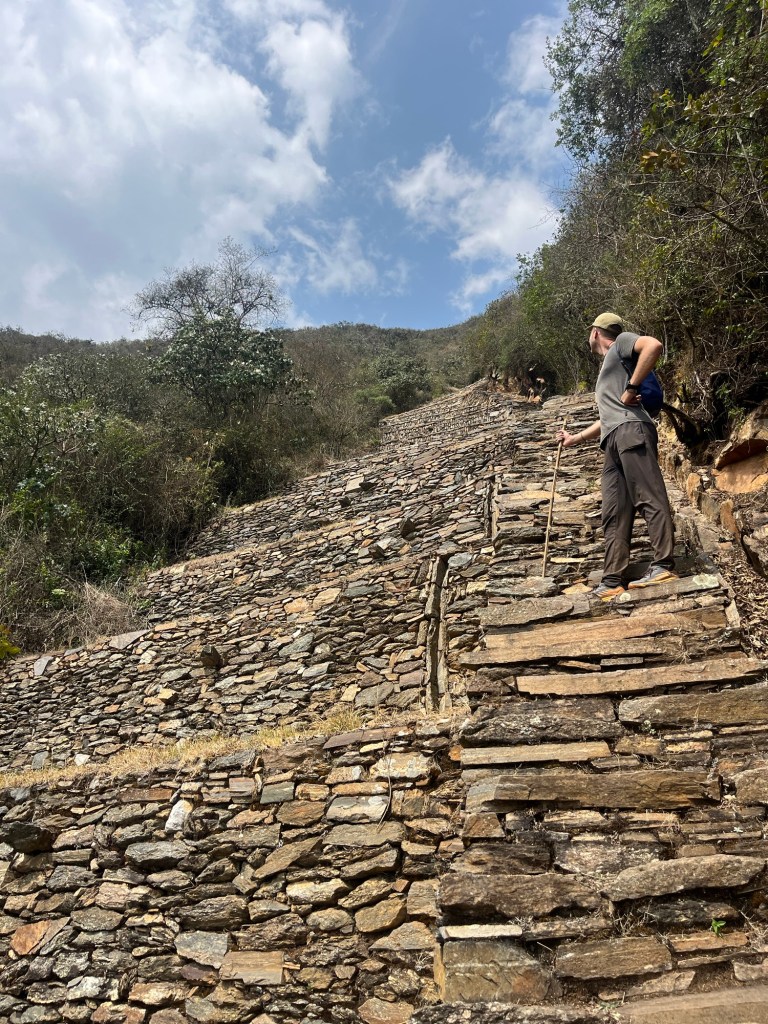 Langs de andere kant van de berg zijn heel veel steile terrassen te zien. Terrassen zijn meestal niet de dingen die je perse van dichtbij moet gaan kijken. Maar langs deze terrassen, die maar voor een stukje zijn vrijgemaakt van begroeiing, volgden we de hele steile en grote treden ver naar beneden. (En daarna dus ook terug naar boven)
