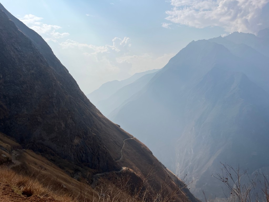 Vanuit onze lodge ‘s avonds hadden we zicht op een grote bosbrand aan de overkant van een andere vallei. Een vuurtje dat uit de hand is gelopen. In Ecuador en Peru is het een standaard activiteit als je u verveelt: een stuk natuur in brand steken. We zijn het regelmatig tegengekomen tijdens het hiken; Zwarte stukjes grond, soms zie je er een doosje stekjes naast liggen. Heel raar. Vaak zijn het ook boeren die hun stuk land afbranden na de oogst, maar soms ook jongeren die met een jerrycan in de hand gelukzalig naar hun bosbrandje staan te kijken vlak naast de baan. Dit laatste tafereel namen we waar vanuit de auto toen we terug naar Cusco reden na deze trek. En het rare is dat niemand zich hier zorgen over maakt. Maar soms loopt het dus wel degelijk uit de hand. Er waren verschillende branden in de buurt, ook zijn er momenteel erge bosbranden in het Amazonewoud in Bolivië en Brazilië wat maakt dat de uitzichten de laatste tijd altijd heel troebel zijn.