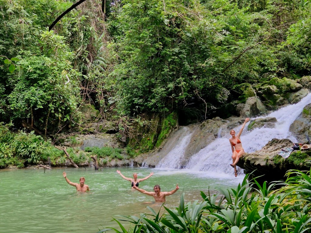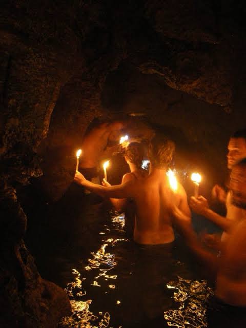 We volgenden een gids met een kaars in de hand in een grot met water. We zwommen, klommen door watervallen naar boven, sprongen naar beneden in water en verdwenen in gaten. Het zag er heel mystiek uit met de kaarsen in de hand en op de grotwanden geplakt. We namen zelf geen foto’s maar hier is een foto van het internet om de sfeer weer te geven.