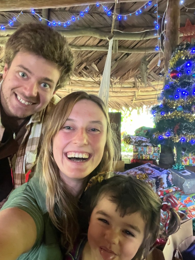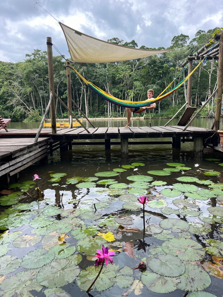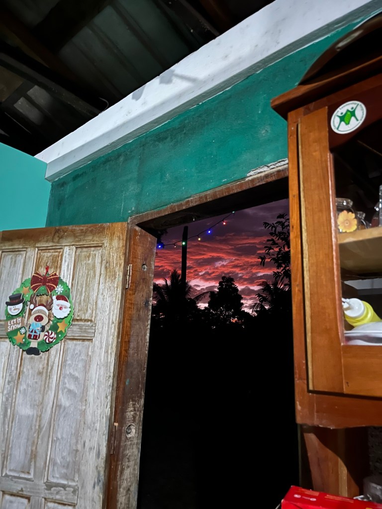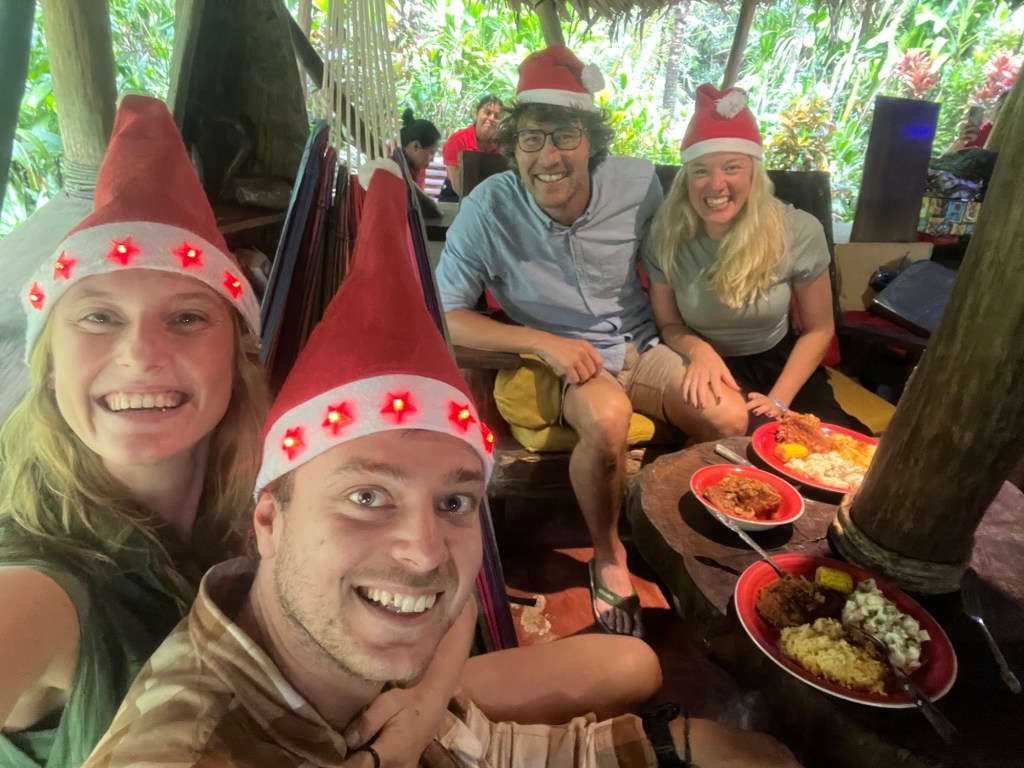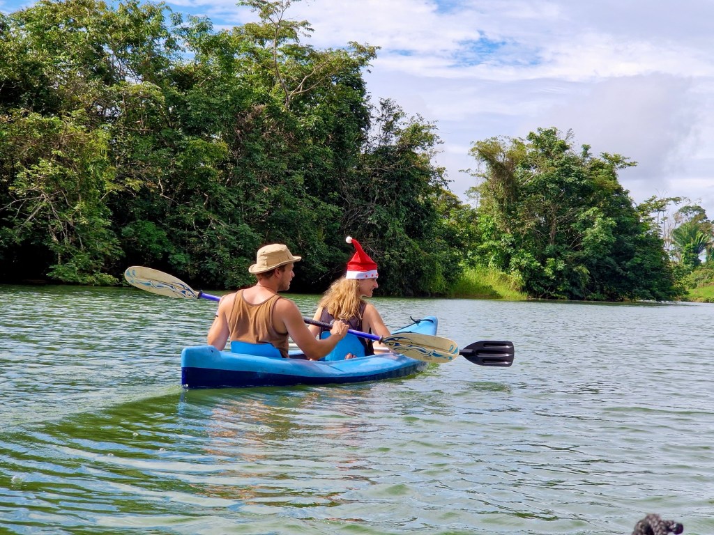 Dat hostel was enkel te bereiken via een boot. De plaats viel ons meteen in de smaak toen we aankwamen! Prachtige junglehutjes in een jungle tuin, langs de rivier met grote lelies. Hangmatten en schommels boven het water verwelkomen ons. We blijven 4 nachten en hier vierden we kerst. Het weer is nog steeds bewolkt en regenachtig.