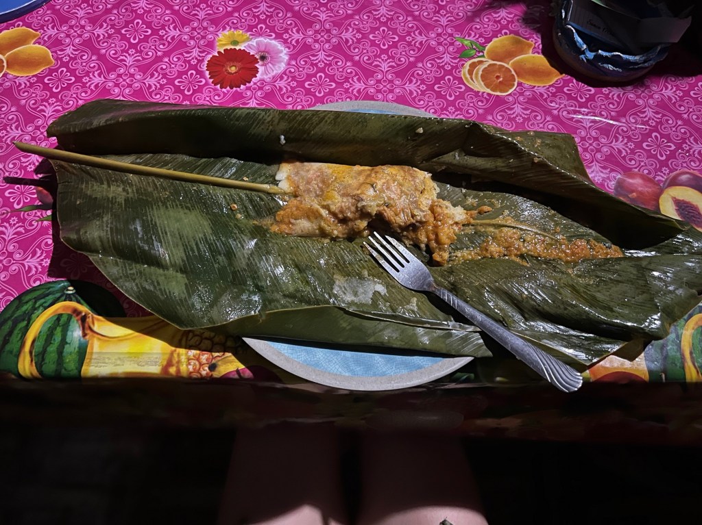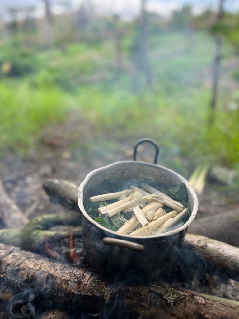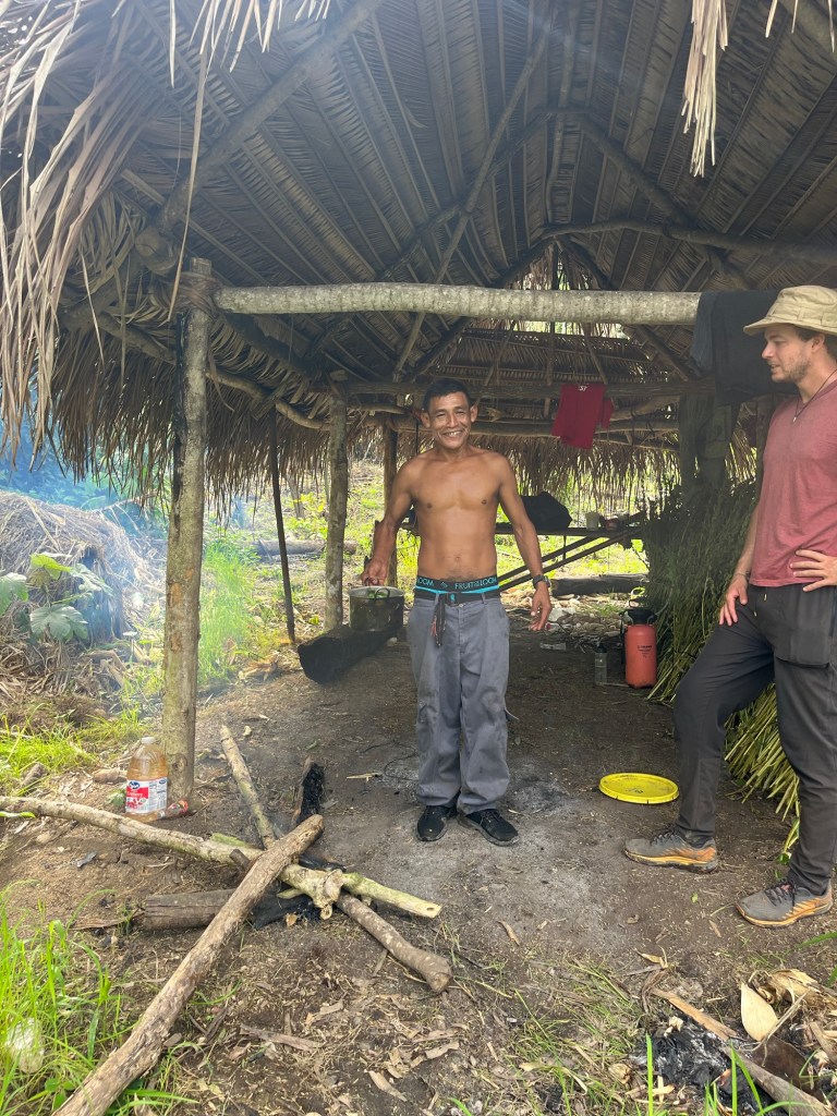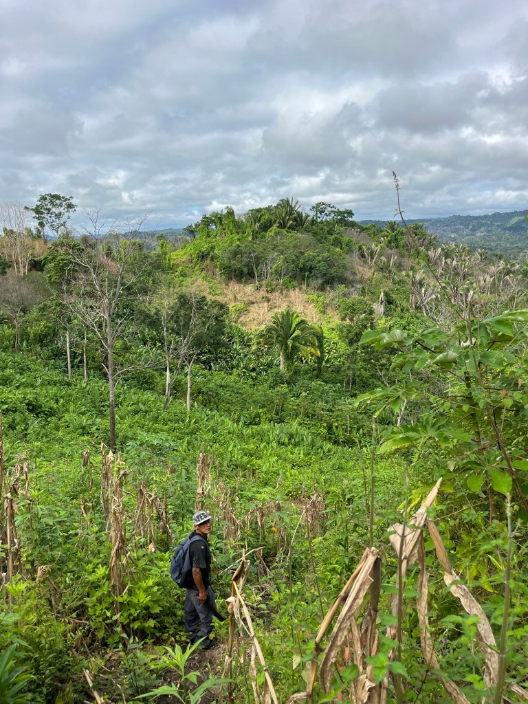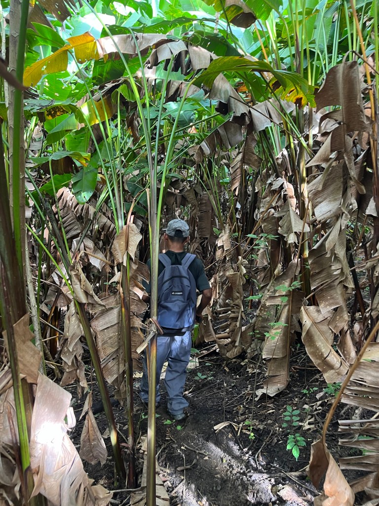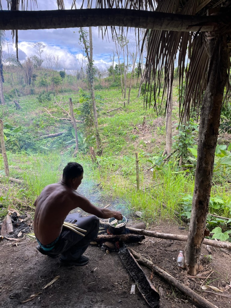 Nus neemt ons mee naar zijn landgoed in de jungle waar hij planten teelt, een uur wandelen van hun huis. Met zijn machete baant hij een weg door zijn ‘boerderij’. Ik zie een dikke slang van 2-3meter in de bomen hangen, maar Nus is niet erg onder de indruk. Zijn boerderij-grond is gigantisch, enkele heuvels in de omgeving blijken zijn ‘boerderij’ te zijn. Hij plukt hier en daar planten; tomaten, paprika, ajuin, maar ook wat onbekende zoals stengels van palmen. Hij maakt op een vuur lunch voor ons klaar. Het was heerlijk!