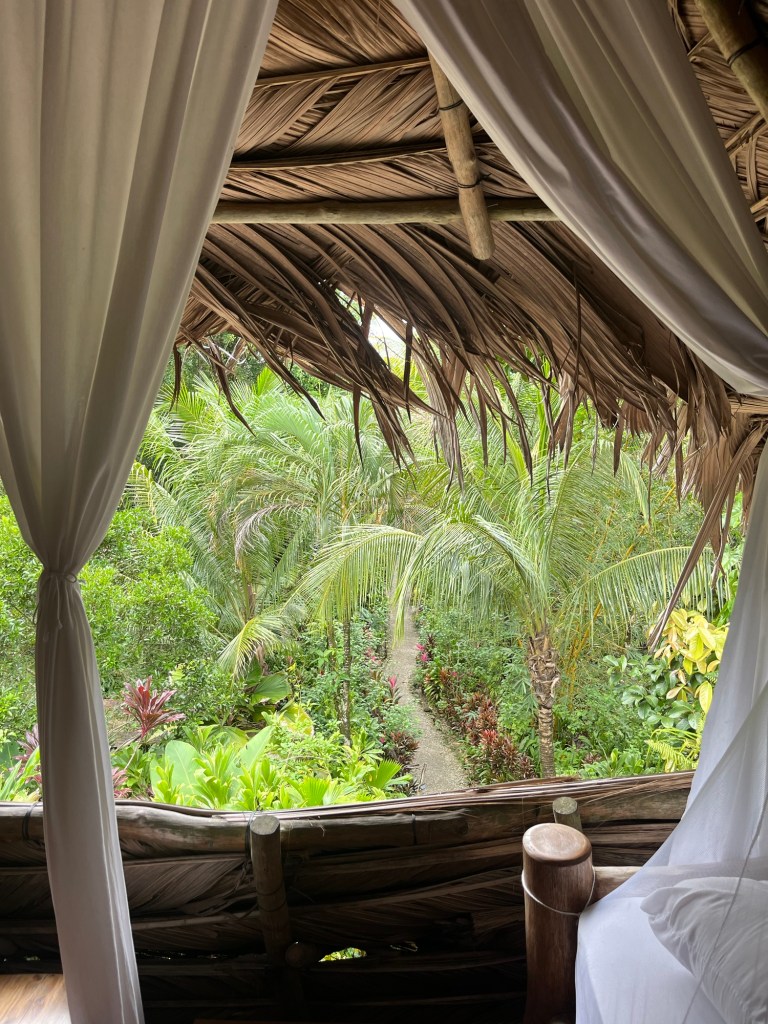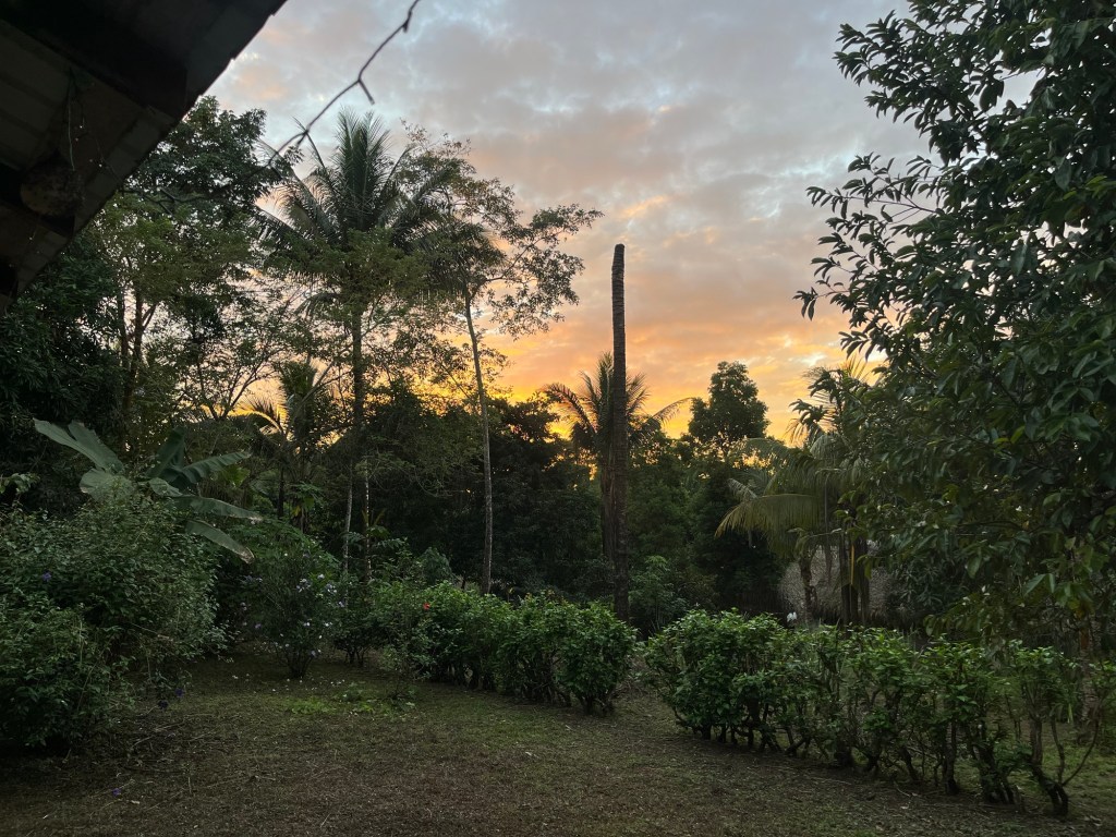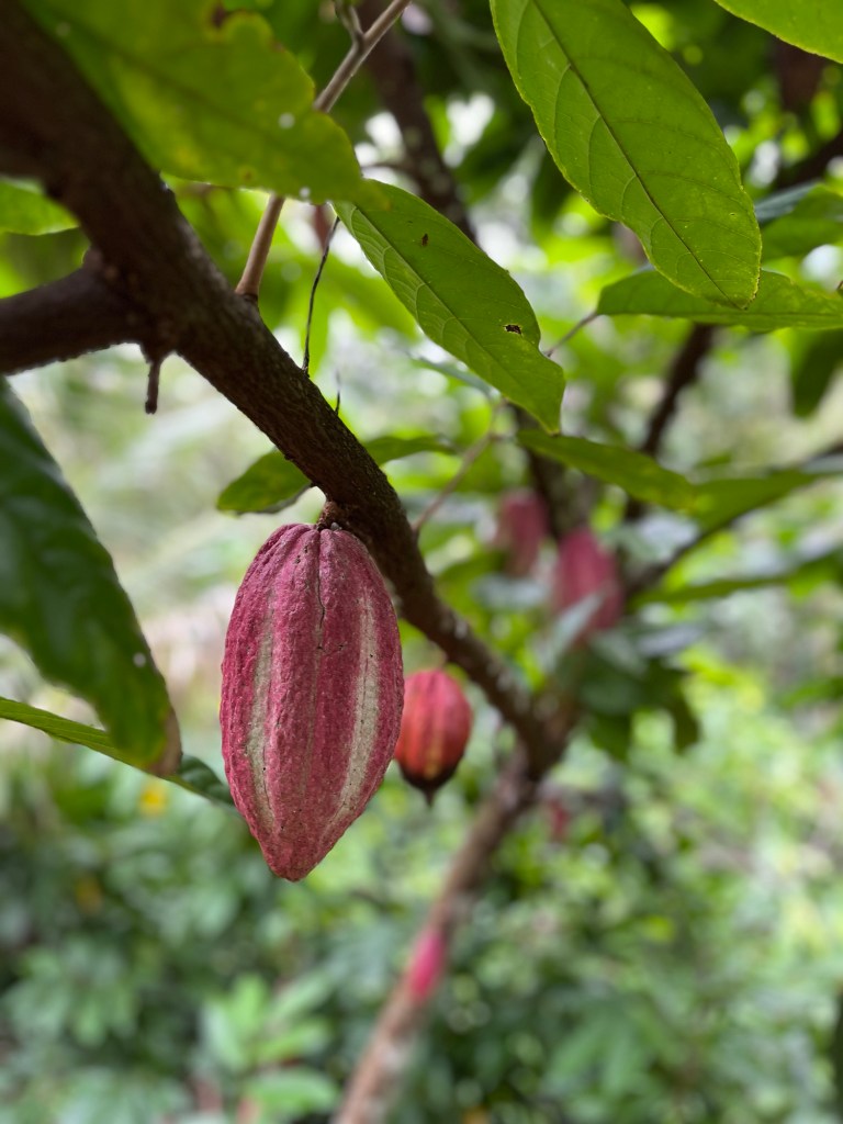 Het hostel is omgeven door cacaobomen met ontzettend veel prachtige paarse vruchten. Ik noem het een chocolade-sprookjesbos.
