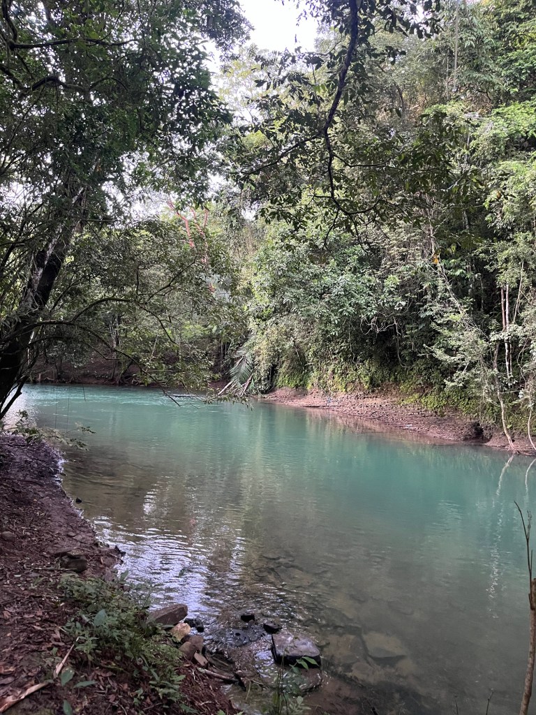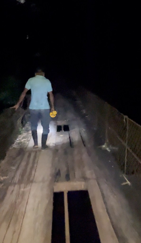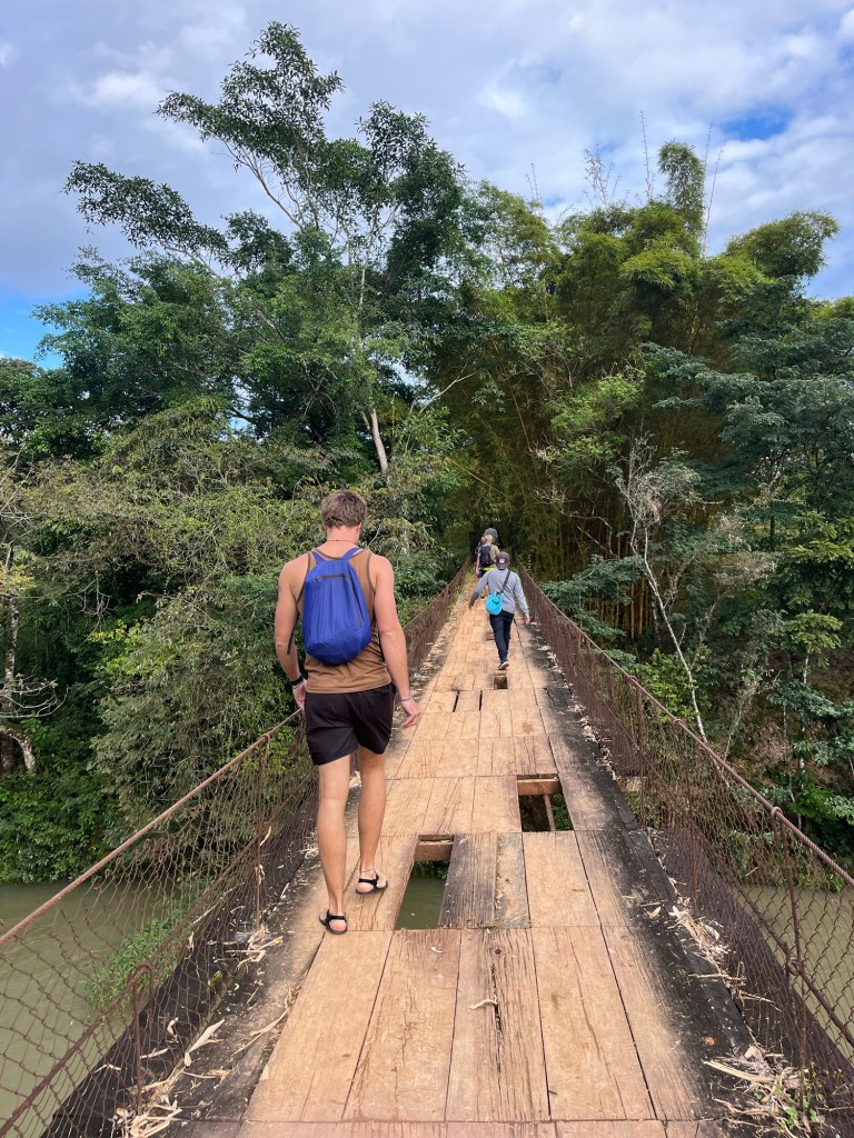 Het is donker wanneer we vervolgens door señor Raul 30 minuten door de jungle geleid worden naar ons hostel. Het is een Indiana Jones sfeer; we weten te ontkomen aan een zeer actieve tarantula, we trotseren de oude hangbrug hoog boven de wilde rivier en vervolgens zetten we onze weg verder door de diepe modder.