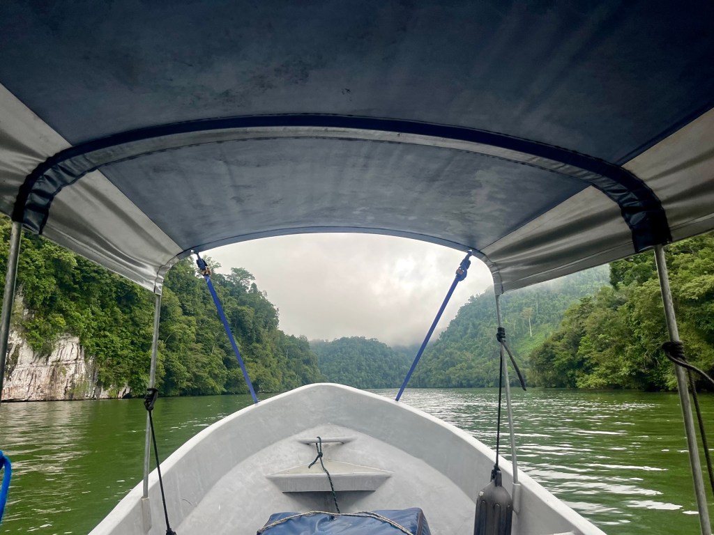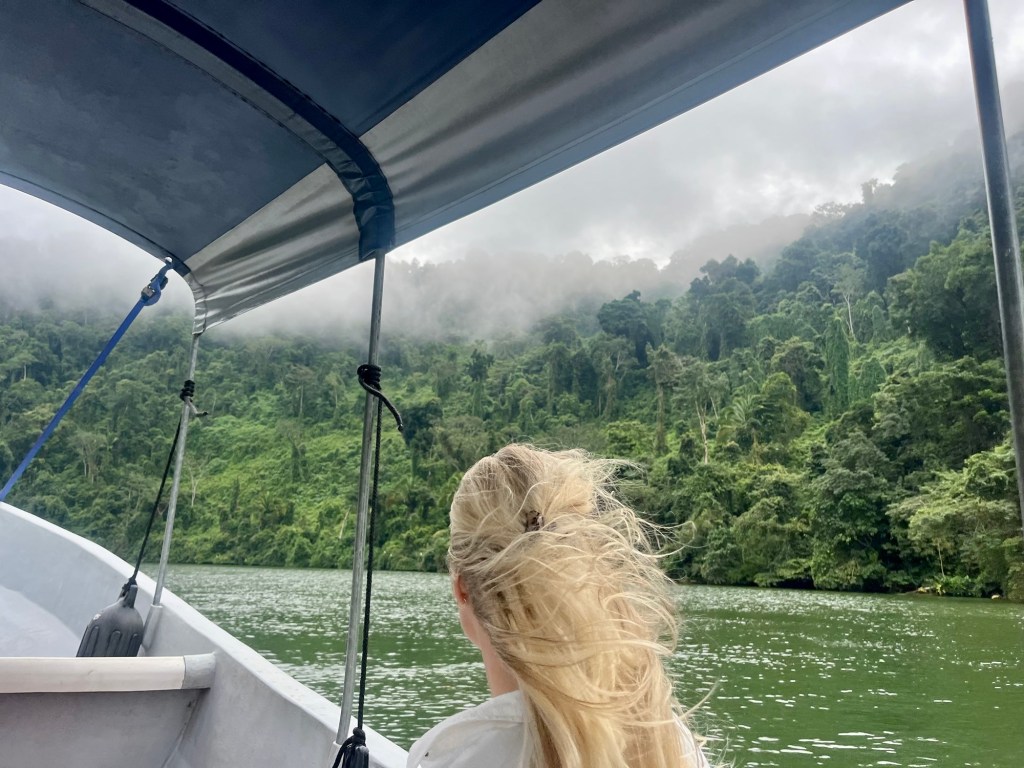 De korte boottocht hierheen was zo ontzettend mooi. We hebben al heel veel gezien, we zijn al veel verwend, maar dit was nog eens een stukje natuur waar mijn mond nog eens letterlijk van open viel! We voeren door een prachtige, bochtige canyon omgeven door bergwanden vol jungle met lagen mist er tussen.