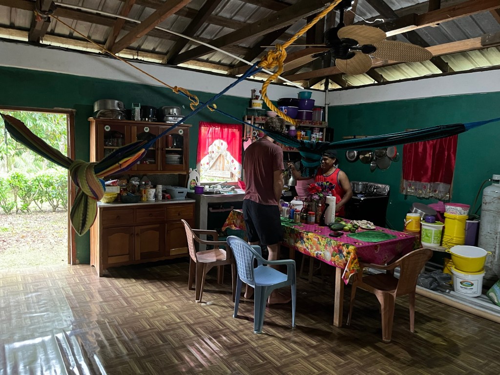 We slapen in een dubbel bed in de enige kamer van het huis. Het is duidelijk hun eigen slaapkamer. Op een avond blijven er zelfs 3 kinderen slapen. Met vijf slapen ze in de living in hangmatten, op een matras op de grond en zelfs rechtzittend in een stoel. Ze vragen 15€ per persoon per nacht, alles inbegrepen: eten, drinken, uitstapjes…