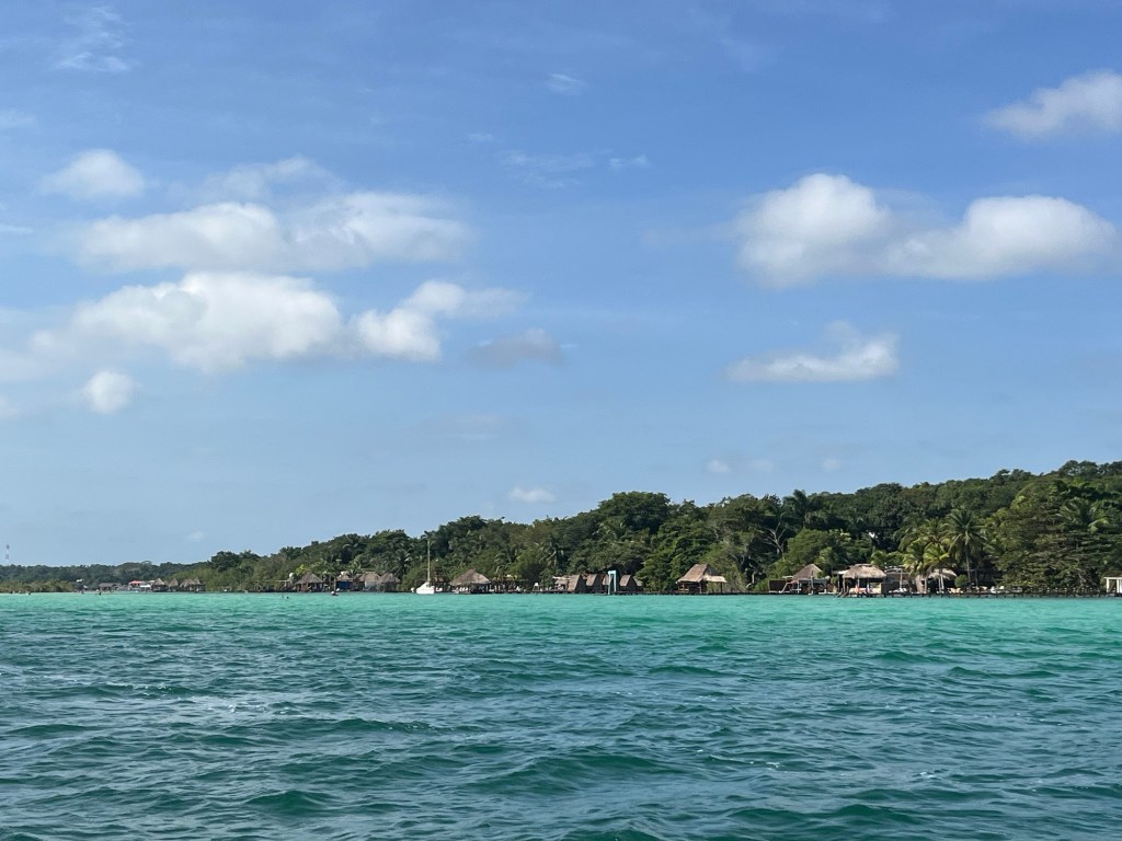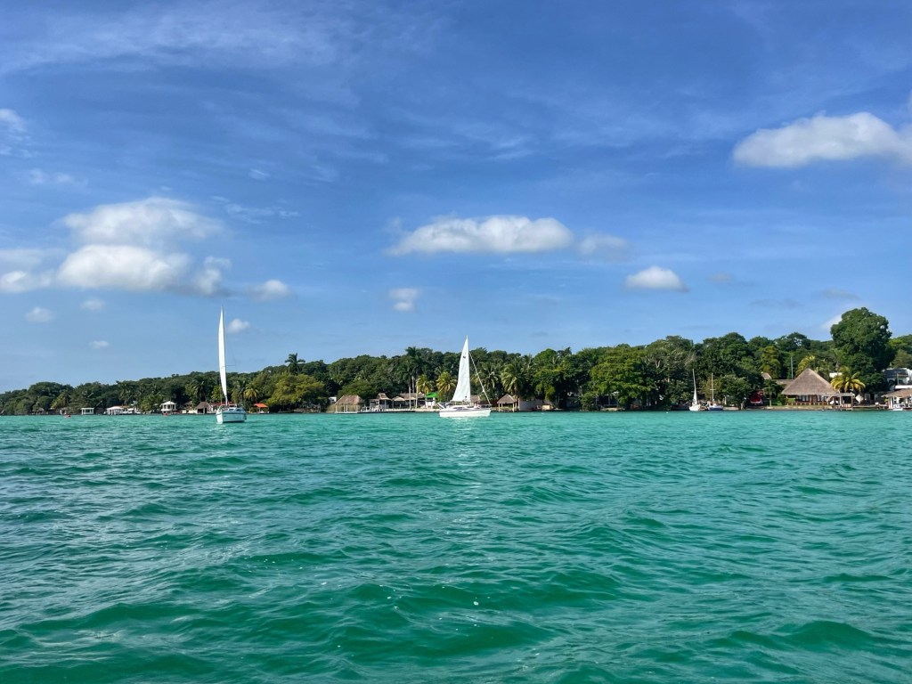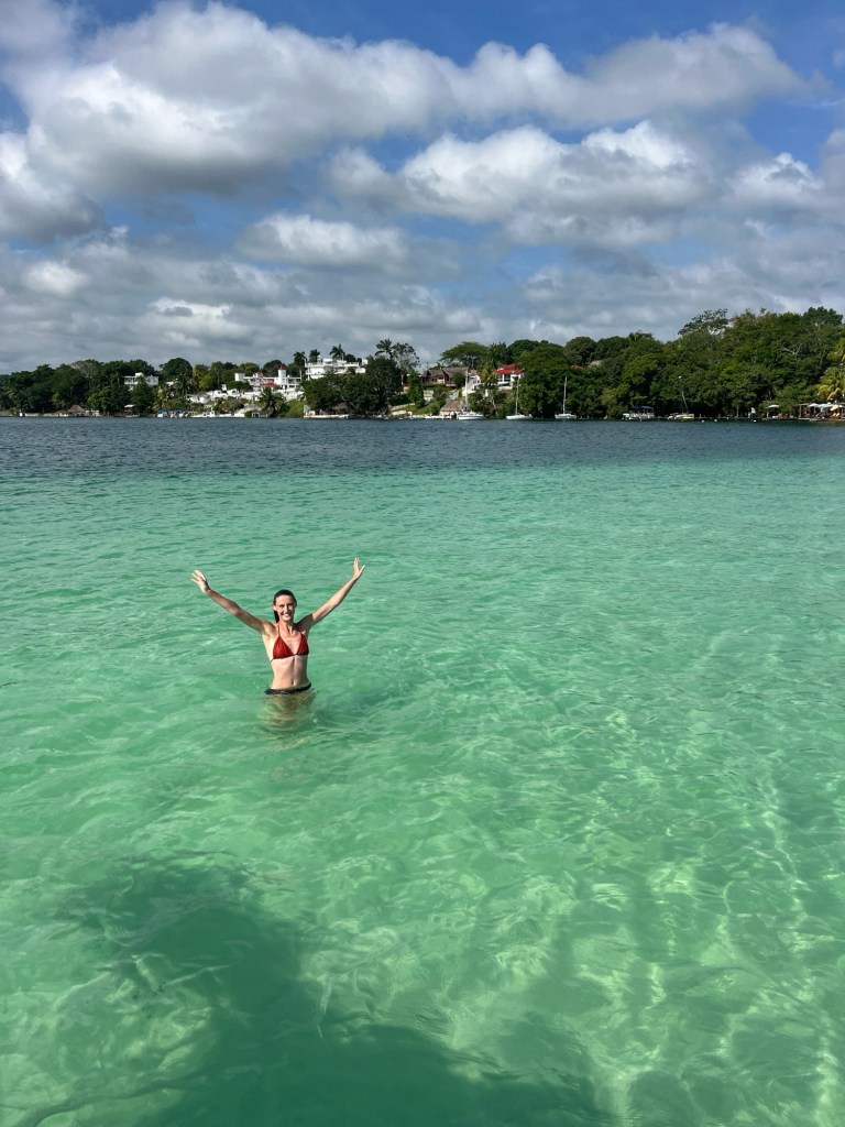We verbleven twee nachten in Bacalar. Een stadje aan ‘seven color lake’. Dit megaheldere blauwe meer staat verbonden met de zee via een klein kanaal, dat vroeger gebruikt werd door piraten om de stad te plunderen. We deden een tour van een paar uur op een boot met enkele zwemspots op het meer.