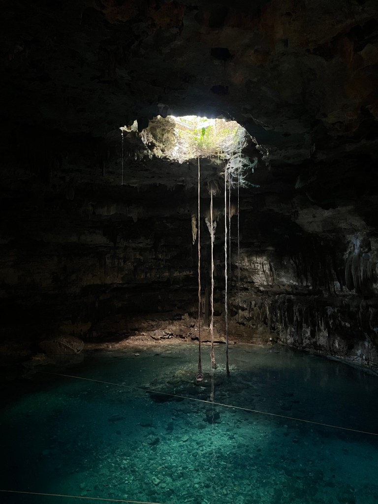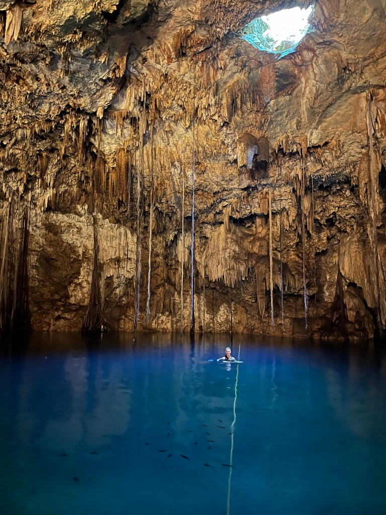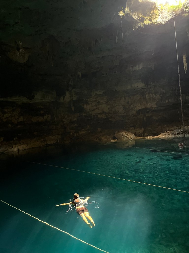 Volgende stop was in Valladolid waar we drie cenotes bezochten. Een cenote is een diep zinkgat met water ontstaan door ondergrondse rivieren. In Yukatan zijn er honderden en in de meeste kan je zwemmen. Deze zijn wel heel toeristisch en je moet zelfs een zwemvest dragen. Heel grappig om een groep toeristen te zien dobberen op een hoopje. Maar op de rustige momentjes wel heel leuk!