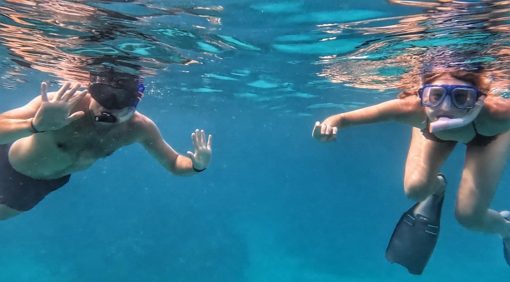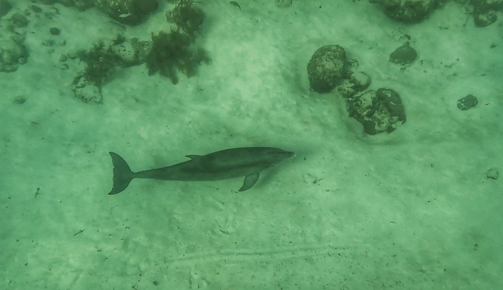 Maar het coolste van allemaal: twee dolfijnen en ook een gigantische dotted eagelray met een immens lange staart. Hij was wel 2-3 meter lang, de rest was al terug in de boot toen hij passeerde. Wij waren de enige die hem zagen dus de gids heeft geen foto genomen.