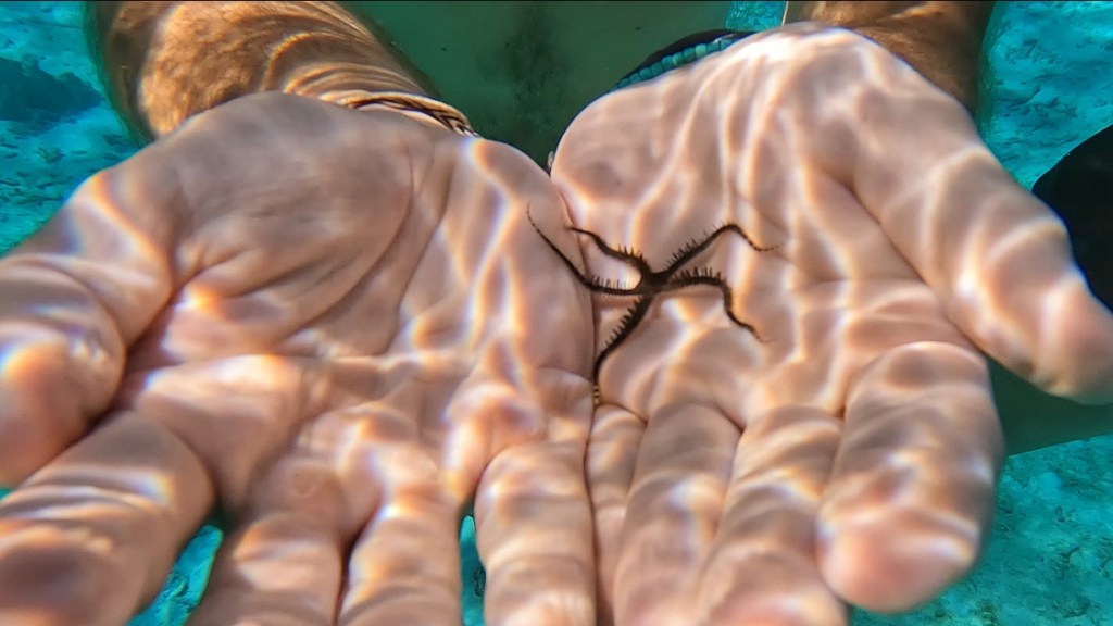 We speelden in de zee en zagen 3 van deze zeemonsters in het ondiepe water. Ik moest opzoeken wat het was want we wisten het echt niet; een zeespin, een octopus of een zeester met veel te veel poten. Was een beetje eng. Het bleek de laatste optie te zijn.