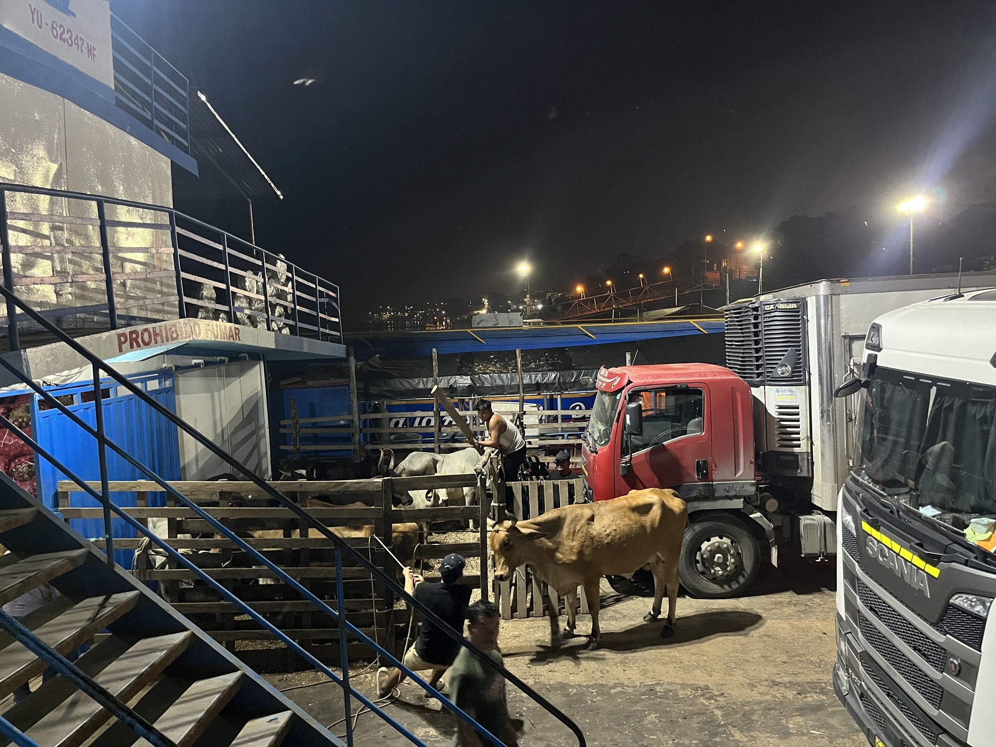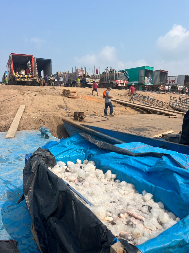 Het was interessant om de chaos in de haven te bekijken. De boten liggen naast elkaar en als er een boot tussen moet, botsen ze gewoon tegen de anderen om ze uit de weg te duwen. Op de boot naast ons werd een vrachtwagen gereden over houten planken. Kippen in kleine hokjes werden op elkaar gestapeld. Een andere boot werd beladen met koeien die duidelijk aan het afzien waren. Ze hadden schrik en werden gewelddadig op het dek gesleurd. Onze boot was vooral volgestopt met groenten en fruit. Dat werk moet ongeloofelijk zwaar zijn. Mannen dragen zakken tot 80 kg (!) op hun rug in de bakkende zon de hele dag door, op hun slippers.
