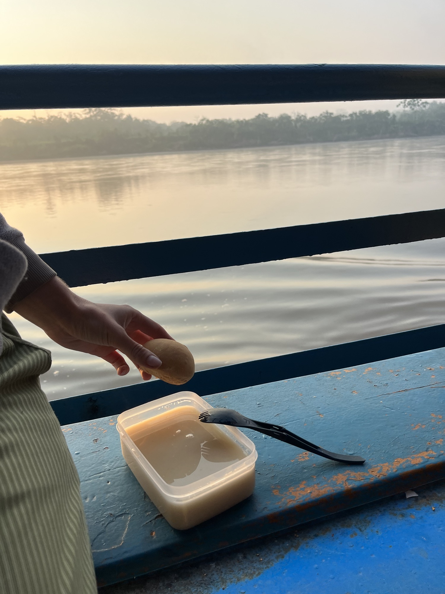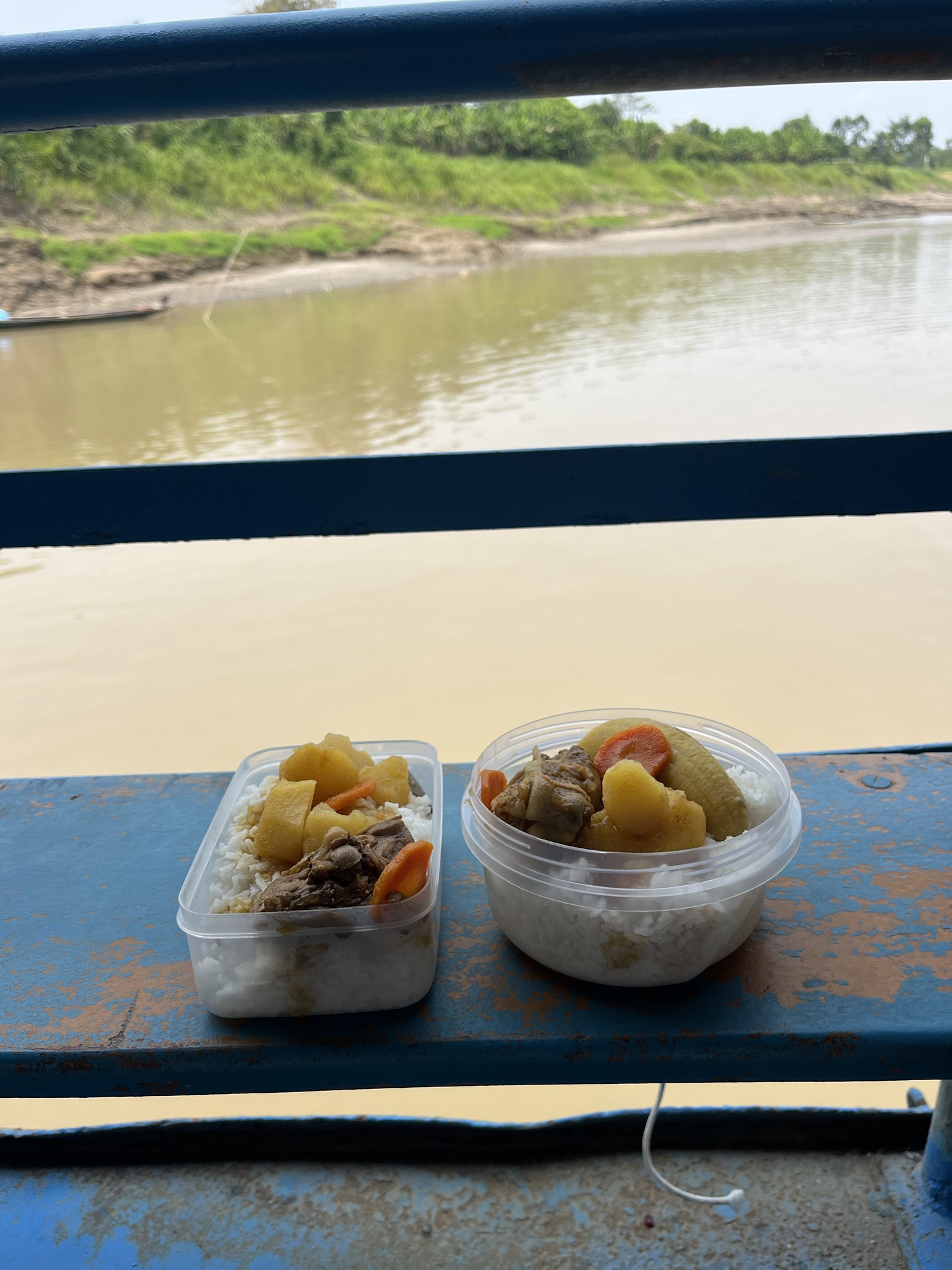 Op de boot krijgen we drie maaltijden per dag. De koks rammelen hun lepel tegen het metaal als signaal dat het eten klaar is en iedereen begint aan te schuiven met hun plastieken potje. Ze scheppen het potje vol, of het nu klein of groot is, dus het is beter om een groot potje mee te nemen. Het ontbijt was heel zoet grijs slijm, avondeten extreem zoute soep en lunch was pasta met rijst en kip. Het was beter te eten als het klinkt, honger is de beste saus!