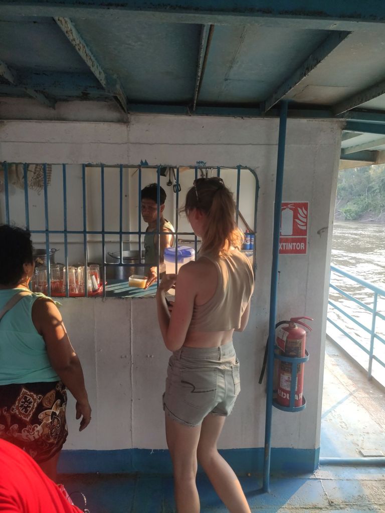 Overdag was het bloedheet, in de nacht vochtig en koud. De enkele mogelijkheid tot verkoeling was in de roestige kabines achteraan op de boot. Een ijzere pot stelde het wc voor, en de kraan bovenaan de douche. Heel spijtig dat we hier geen foto van hebben want dit was officieel het ranzigste wc van Zuid-Amerika. Maar toch waren we heel dankbaar voor de mogelijkheid om te douchen.